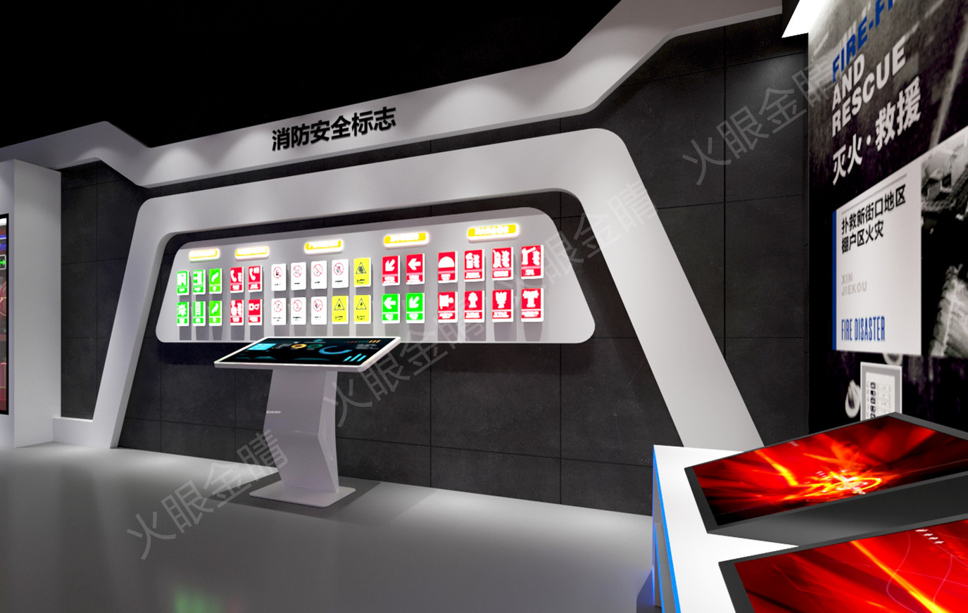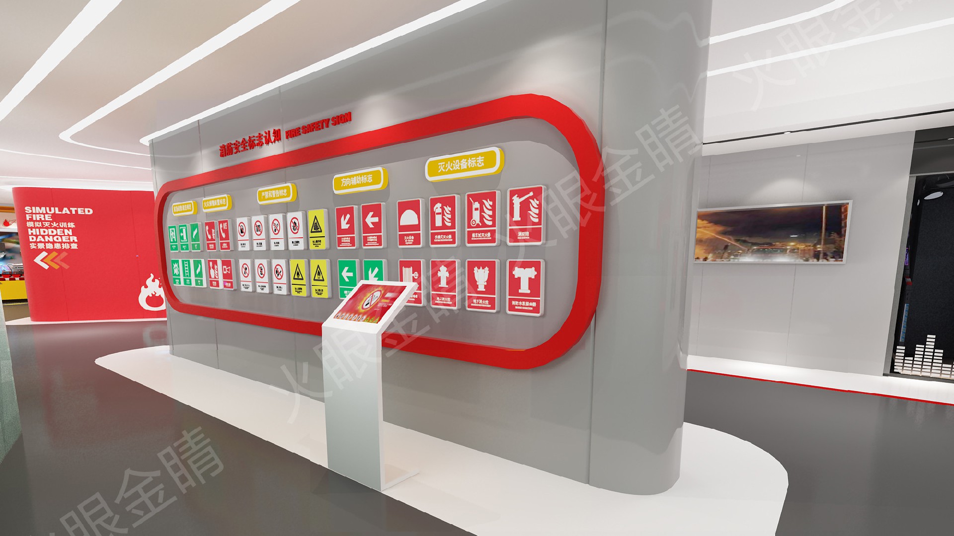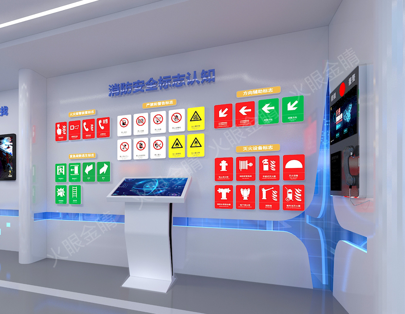 消防安全標(biāo)志認(rèn)知系統(tǒng)包含32個消防標(biāo)志圖標(biāo),通過點擊觸摸屏上標(biāo)志圖標(biāo),會有對應(yīng)的語音播報,以及對應(yīng)的燈箱會被點亮,使體驗者熟悉和了解建筑中配備的各種消防標(biāo)識和安裝位置,幫助體驗者養(yǎng)成在遇到危險情況下參照標(biāo)志行動的行為習(xí)慣。