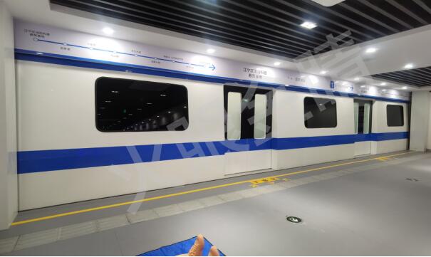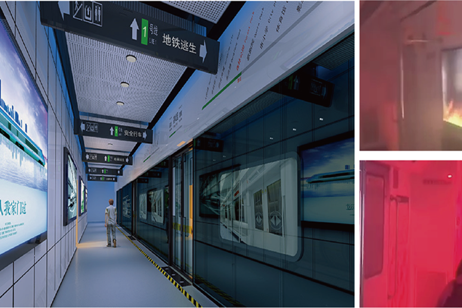 地鐵事故自救逃生體驗系統(tǒng)由地鐵車廂1:1的仿真模型和控制系統(tǒng)組成。體驗開始后,參觀者從站臺進(jìn)入車內(nèi),地鐵開始模擬運(yùn)行,在前進(jìn)過程中,通過煙霧機(jī)、火焰機(jī)和3D動畫營造車內(nèi)著火氛圍,廣播提示體驗者進(jìn)行逃生演練??汕猩眢w會地鐵著火事故,學(xué)習(xí)逃生知識和進(jìn)行逃生技能實訓(xùn)。