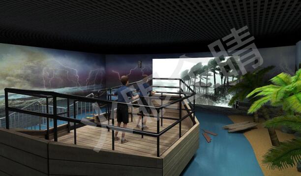沉浸式暴風雨體驗根據(jù)臺風現(xiàn)象,采用先進的多媒體和實景結(jié)合技術(shù),模擬臺風登陸城市的景象,在真實的空間里模擬12級臺風,使體驗者有身臨其境的感覺。臺風體驗項目體驗者穿上雨衣進入體驗區(qū)域,強風機和噴水機制造強風和水珠特效,投影畫面與臺風實時同步,用視頻表現(xiàn)臺風天氣城市的狀態(tài),震撼的音響效果,實景式的視覺、聽覺、觸覺使體驗者得到全方位的感受。通過體驗臺風降臨,普及臺風知識,提高自我保護意識。